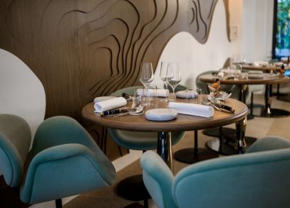 L'alchimie a bien lieu à l'étage, avec une cuisine ouverte flanquée d'un long comptoir (où il est très agréable de s'attabler seul et d'assister au ballet des cuisiniers) et dans laquelle crépite un authentique four à bois ainsi qu'une multitude de modes de cuisson hérités des traditions asiatiques. Le menu dégustation unique (70 € au déjeuner en 4 services, 140 € en 7 étapes au dîner) révèle une cuisine sensible et d'une netteté exemplaire avec par exemple ce thon rouge ikéjimé de Saint-Jean-de-Luz servi cru/poivron rouge au feu de bois/jus de rhubarbe/câpres frites/crème fraîche épaisse ou la finesse des produits dans leur simplicité nue. Autre exemple, ce bouquet de feuilles et fleurs à croquer, juste assaisonné de miel, en amuse-bouche. C'est frais, c'est juste, c'est la mise en valeur du produit brut, tout en délicatesse, l'expression d'une sensibilité venue d'Orient couplée au respect le plus strict des matières naturelles.