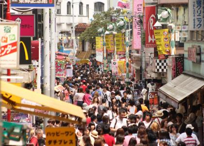 Après avoir englouti notre plat, on reprend la direction la station Harajuku et en particulier la rue Takeshita-dōri. Très appréciée des adolescents et des jeunes japonais, c’est l’un des meilleurs spots de la ville pour s’immerger dans un pan de la culture populaire japonaise. On y croise des milliers de jeunes qui ont troqué l’ennuyeux uniforme de la semaine (d’où l’importance de faire cette balade un dimanche) pour des tenus plus excentriques les unes que les autres : les fans de cosplay (mot-valise composé de costume et playing désigne les fans reprenant le rôle de ses personnages de fiction favoris, en particulier issus du monde des mangas, des comics ou des jeux vidéos) côtoient les gothiques, les Lolitas et autres jeunes filles aux tenues disco-pop acidulées. Takeshita-dōri est l’une des rues de la ville qui abrite le plus de boutiques de mode pour ces adolescents avides de tenues originales et colorées. Piétonne et étroite, elle est toujours noire de monde le dimanche lorsque les jeunes viennent y faire leurs shopping.