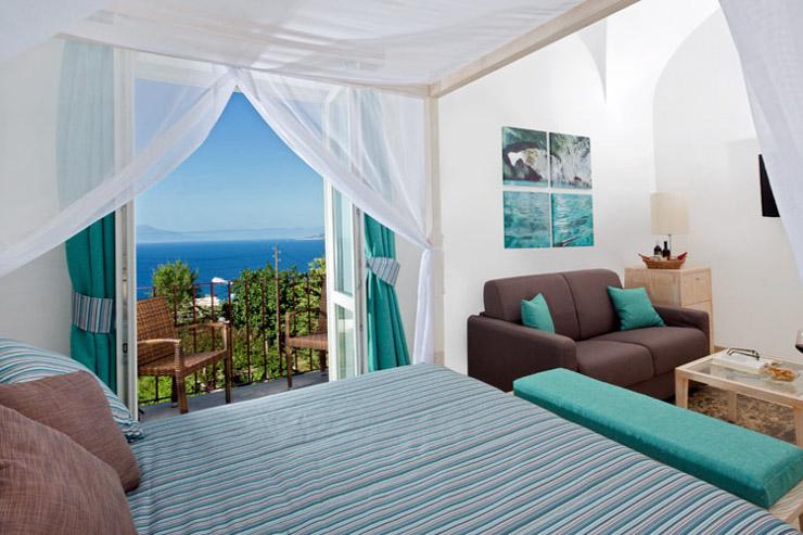 Sur les hauteurs de Marina Grande, cet établissement géré par la famille Coppola (pas de rapport avec Francis Ford ou Sofia) est l'un des derniers arrivés sur la scène hôtelière capriote. Et le moins qu'on puisse dire, c'est que tout a été fait pour séduire des voyageurs à la fois exigeants et sensibles au rapport qualité-prix. Lit à baldaquin, décor contemporain, WiFi ultra rapide et Apple TV font partie ici du décor, tout comme les spectaculaires vues sur la Méditerrannée, depuis les terrasses des chambres comme celle du petit-déjeuner. Vivement recommandé.