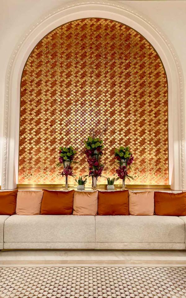 Dans le Grand Salon classé aux Monuments Historiques, les lustres et les chapiteaux ont été redorés. De retour au lobby, on bascule du côté du Tea lounge Camélia (nommé en référence au « Camellia Sinensis », le nom botanique de l’arbre à thé) où les hôtes peuvent déguster 60 variétés de thé du monde entier. La palette de couleur du salon oscille entre les blancs, le rose, le vert eucalyptus et la terracotta, des teintes claires qui réfléchissent la lumière transversale émanant de la mer Méditerranée et du jardin intérieur. Au bar 58°, qui fait référence à l’adresse de l’hôtel, des lustres de Venini et un pied de comptoir en bois calquant des nervures de feuilles d’eucalyptus se mêlent à un paravent en moucharabieh à l'inspiration plus orientale.Â