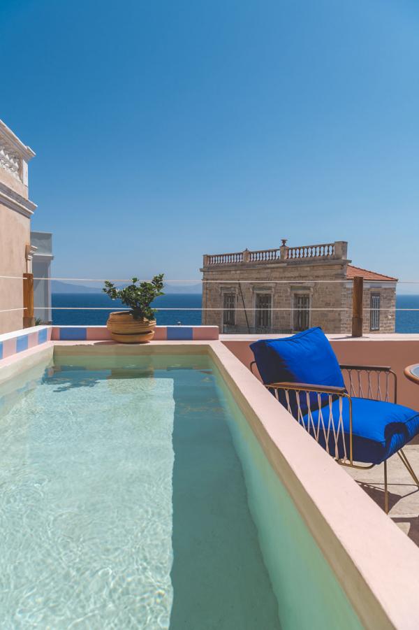 La suite Kapandriti présente une veranda privée et une piscine à débordement avec vue sur le quartier historique de Vaporia
