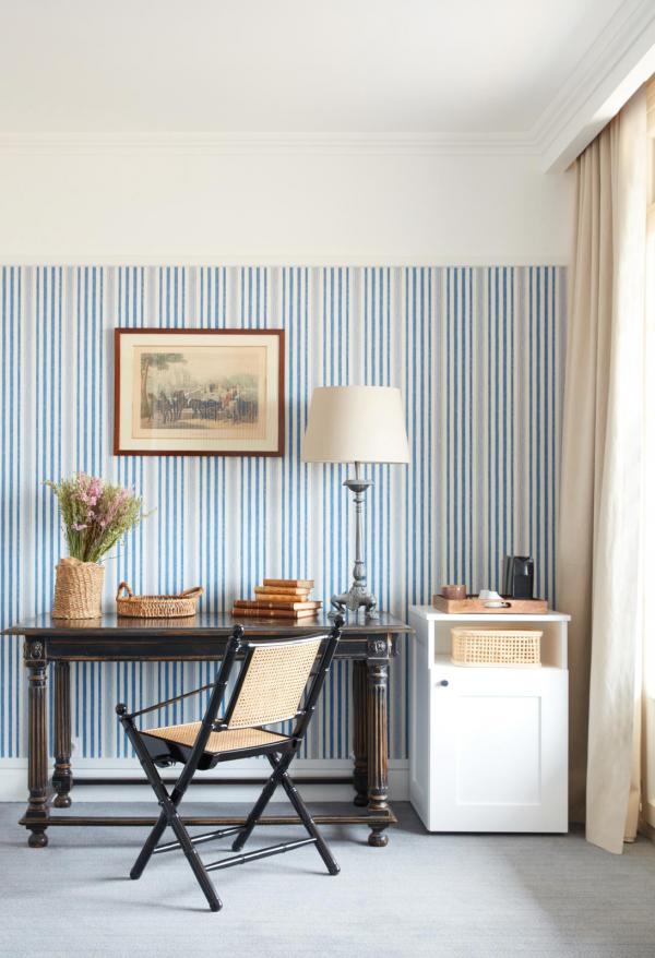 - Dressée face à la mer, la demeure à colombage arbore sur l’un de ses flancs une gigantesque peinture murale en hommage à Gustave Flaubert, signée de l’affichiste Raymond Savignac. Une fois passée la porte, on note la volonté de la décoratrice d’intérieur attitrée à la collection, Natalia Megret, d’avoir voulu conserver le charme légèrement suranné de l’hôtel. À l’entrée, un vieux meuble en bois continue d’accueillir les clients, aux cotés d’affiches publicitaires vintages qui célèbrent le Trouville d’autrefois. Les murs, habillés de couleur marine, tranchent avec un parquet chevron à l’éclat retrouvé. Au sein de 31 chambres, toutes uniques par leur style, la décoratrice a fait le choix de raconter une « histoire d’eau ». Les rideaux couleur sable, s’harmonisent avec ses papiers peints Jane Churchill ou C&C Milano ainsi que les moquettes Hartley & Tissier qui déclinent plusieurs nuances de bleu. Les jetés de lits, dénichés chez The Socialite Family, ont été conçus en laine recyclée. Les meubles en bois et autres objets chinés, baignés par la lumière laiteuse de la mer, apportent une simplicité rassurante qui apaise.