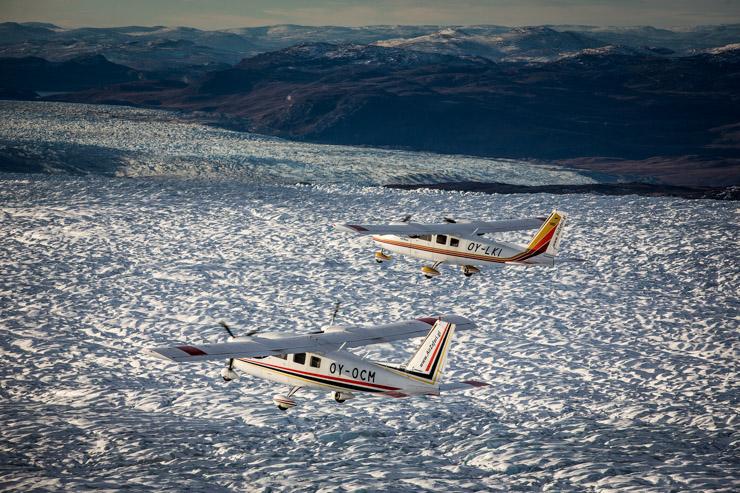 Survol de la calotte glaciaire par deux avions dʼAir Zafari, compagnie spécialisée dans les vols d'observation pour les touristes.