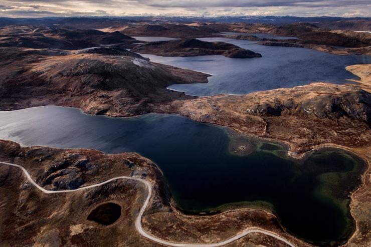 Au premier plan, l'une des rares routes du pays. Elle relie la ville-aéroport de Kangerlussuaq à la calotte glaciaire.