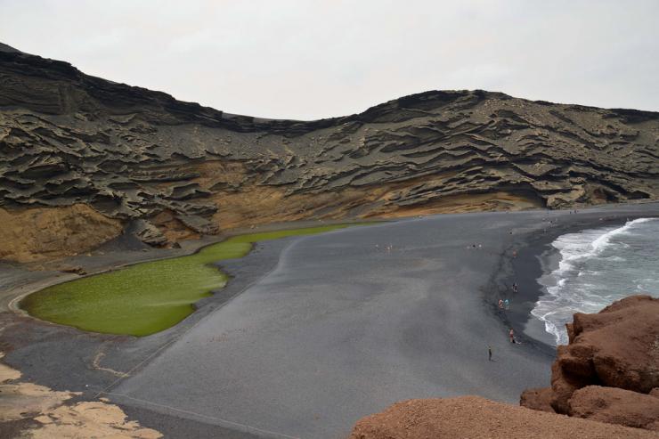 La lagune doit sa couleur aux algues particulières qui s’y sont développées et est connectée à la mer par des fissures souterraines. C’est encore un produit du volcanisme puisque le site est celui d’un ancien cratère. D’après l’article Wikipédia (en allemand) la lagune régresse depuis plusieurs années, phénomène dont les causes échappent encore aux scientifiques.
