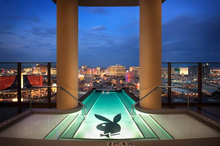 Au sommet du Palms, l'un des hôtels-casinos les plus en vue, la Hugh Hefner Sky Villa est un concentré de la démesure de Vegas : 900 mètres carrés, 4 chambres, 11 écrans plasmas, un lit rotatif, un spa privé, un ascenseur vitré privatif et surtout une piscine vitrée s'avançant dans le vide, comme pour mieux dominer la ville. Plus bling-bling tu meurs.