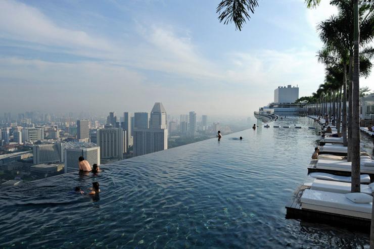 Trois tours de 55 mètres, plus de 2 500 chambres, un casino, une salle de spectacle, un musée ultra-moderne, il ne fait pas de doutes que le Marina Bay Sands à Singapour rivalise avec les plus spectaculaires hôtels de Las Vegas. Mais le must reste évidemment sa piscine infinity, longue de 146 mètres et faisant et perchée à plus de 200 mètres d'altitude face à la baie de Singapour et ses skyscrapers. Difficile de faire plus impressionnant.