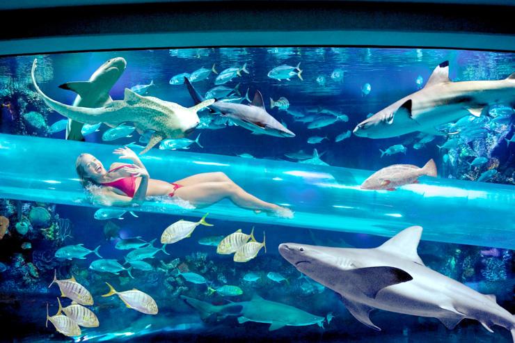 Le toboggan qui projette littéralement les nageurs au milieu du bassin des requins , sensations garanties !