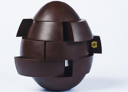 Cette année, la composition la plus marquante est celle inspirée par l'architecture et la poterie :  2 œufs et 1 cloche tournés & garnis, au chocolat noir ou au lait, garnis de friture praliné et de friture sèche.
