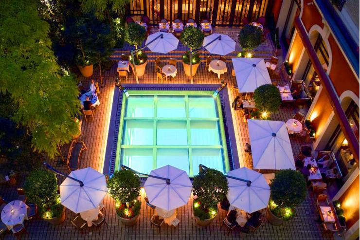 La belle terrasse du Royal Monceau est plus polyvalente que jamais. Surplombant la piscine de l’hôtel, la plus longue de tous les bassins de palaces parisiens avec ses vingt-cinq mètres, elle a la particularité de partager son espace de verdure entre le Bar Long et les deux restaurants de l’établissement : Matsuhisa Paris, le restaurant du chef Nobu ouvert en début d’année et Il Carpaccio, le restaurant Italien historique de l’hôtel, encore aujourd’hui récompensé d’une étoile. Une vraie bonne idée.